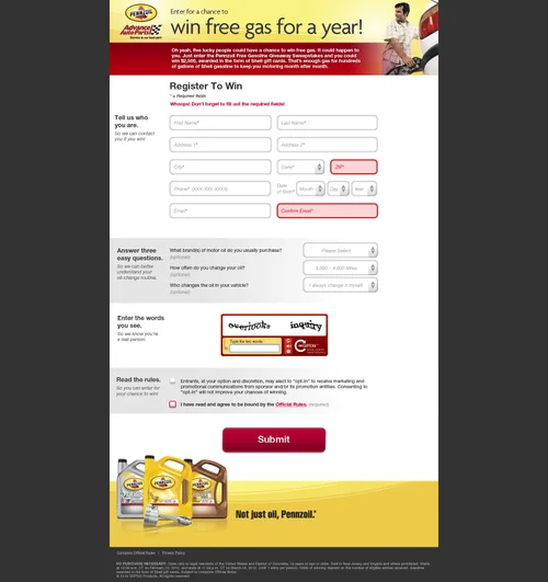 I designed a microsite for a Pennzoil promotion with Advance Auto Parts where users could register to win free gas for a year.